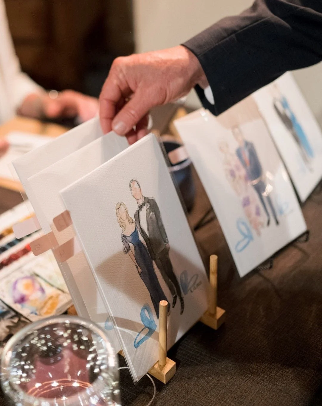 Durante tu evento, fotografio a tus invitados y enseguida los ilustro de una manera express y minimalista en acuarela.